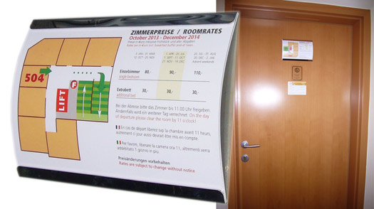Viele unserer Hotelkunden kombinieren das Nützliche mit dem Notwendigen, kombinieten auf einem A5-Schild die aktuelle Preisliste mit den vorgeschriebenen Fluchtweg-Informationen. Der Austausch des Infoblattes dauert keine Minute - Werkzeug brauchen Sie dafür keines!