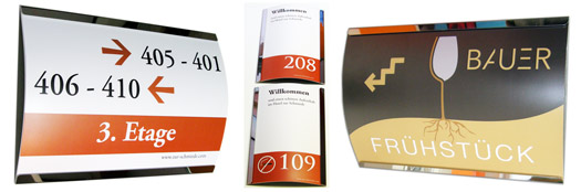 BENDO-Schilder eignen sich hervorragend als Zimmerschilder in Hotels, weil sie auch genügend Fläche für Angebots-Bewerbung, Informationen (zum Beispiel "Nichtraucher"-Kennzeichnung, Foto unten mitte) bieten. Gerne unterstützen wir Sie bei der Gestaltung Ihrer schönen, neuen Schilder!