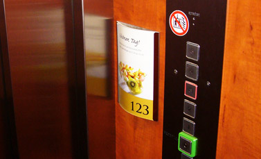 Weil BENDO-Schilder sehr gut zu den Edelstahl-Komponenten von Aufzügen passen, werden sie auch in Hotels immer öfter eingesetzt. Je nach Grösse informieren sie oder bieten auch Packages, etc ... erfolgreich an.