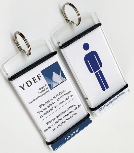 Für den Sanitärbereich von Unternehmen ist es von Vorteil, wenn WC-Schlüsselanhänger personalisierbar sind und Platz für Hygienehinweise bieten ...