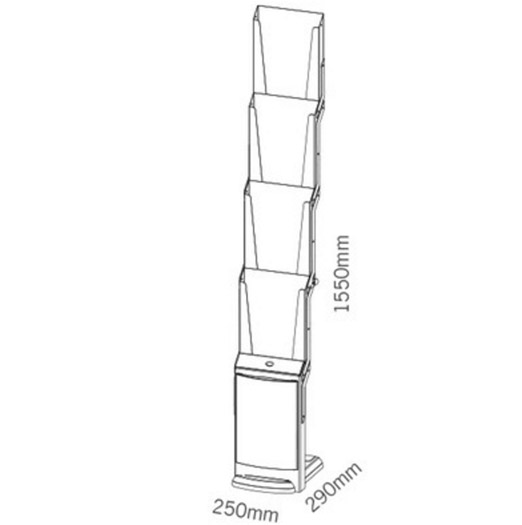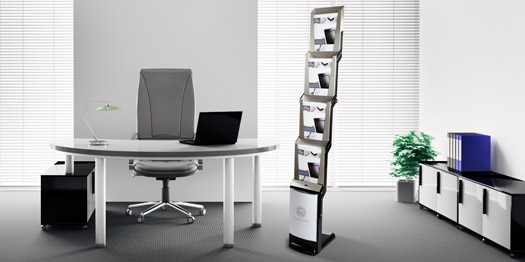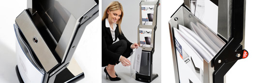 real steel ist ähnlich einfach zu bedienen, wie ein Regenschirm: Im Handumdrehen entfaltet er sich zu einem stabilen Prospektpräsenter. Die 4 Prospekttaschen für A4-Formate sind aus gebürstetem Edelstahl - dank einer speziellen Beschichtung hinterlassen Finger kaum sichtbare Spuren ...