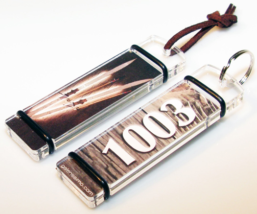 Wir können Ihre schönen, neuen Schlüsselanhänger wie graviertes Holz mit transparentem Schutz aussehen lassen (und so sehen sie dann noch lange aus).